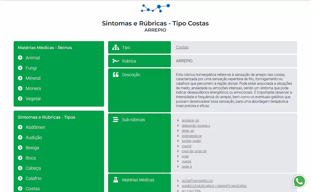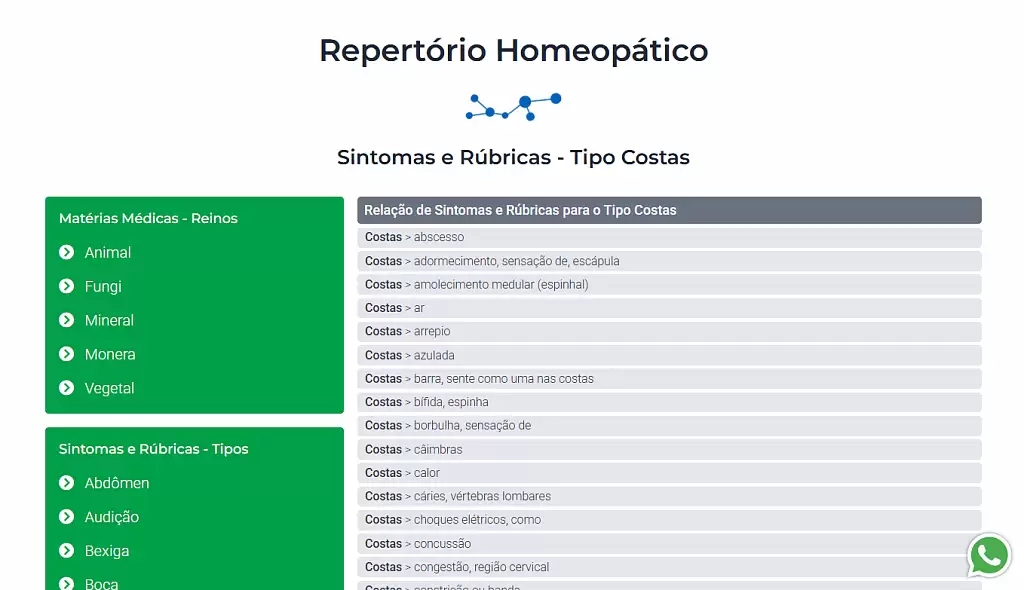 - Taxonomic Organization: Materia medica structured by biological classification (animal, plant, mineral, fungi, monera) and symptoms by anatomical systems (abdomen, auditory, bladder, oral, cephalic) with hierarchical navigation (kingdom → substance → therapeutic properties)