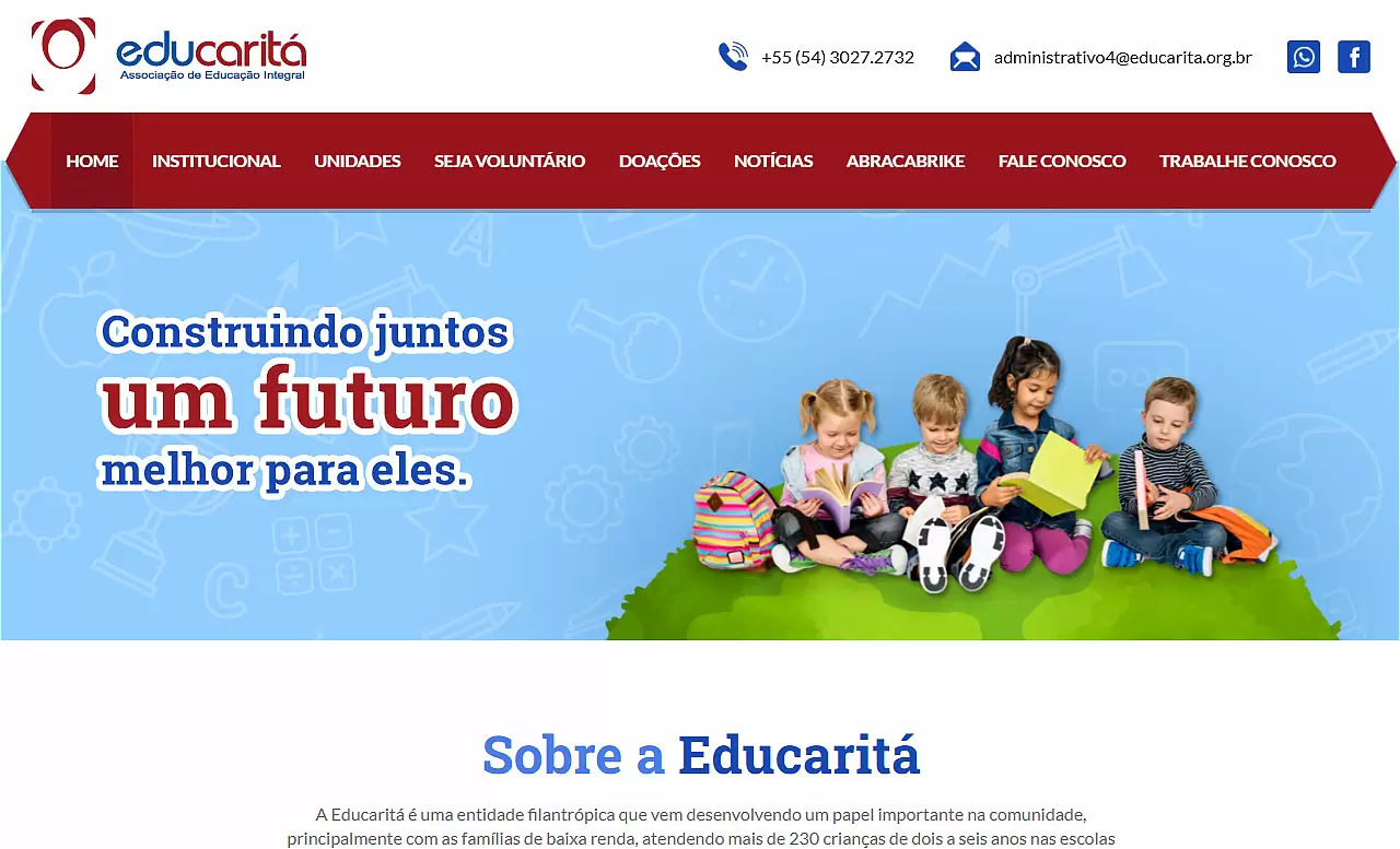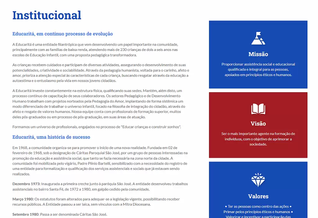 Educaritá, founded in 1968, needed to modernize its digital presence to reach potential donors, volunteers, and families. The organization manages multiple education units and the Educaxias program (15 municipal schools), requiring a platform that could handle complex institutional information, facilitate donations, manage enrollment processes, and maintain transparency through news updates — all on a limited non-profit budget.